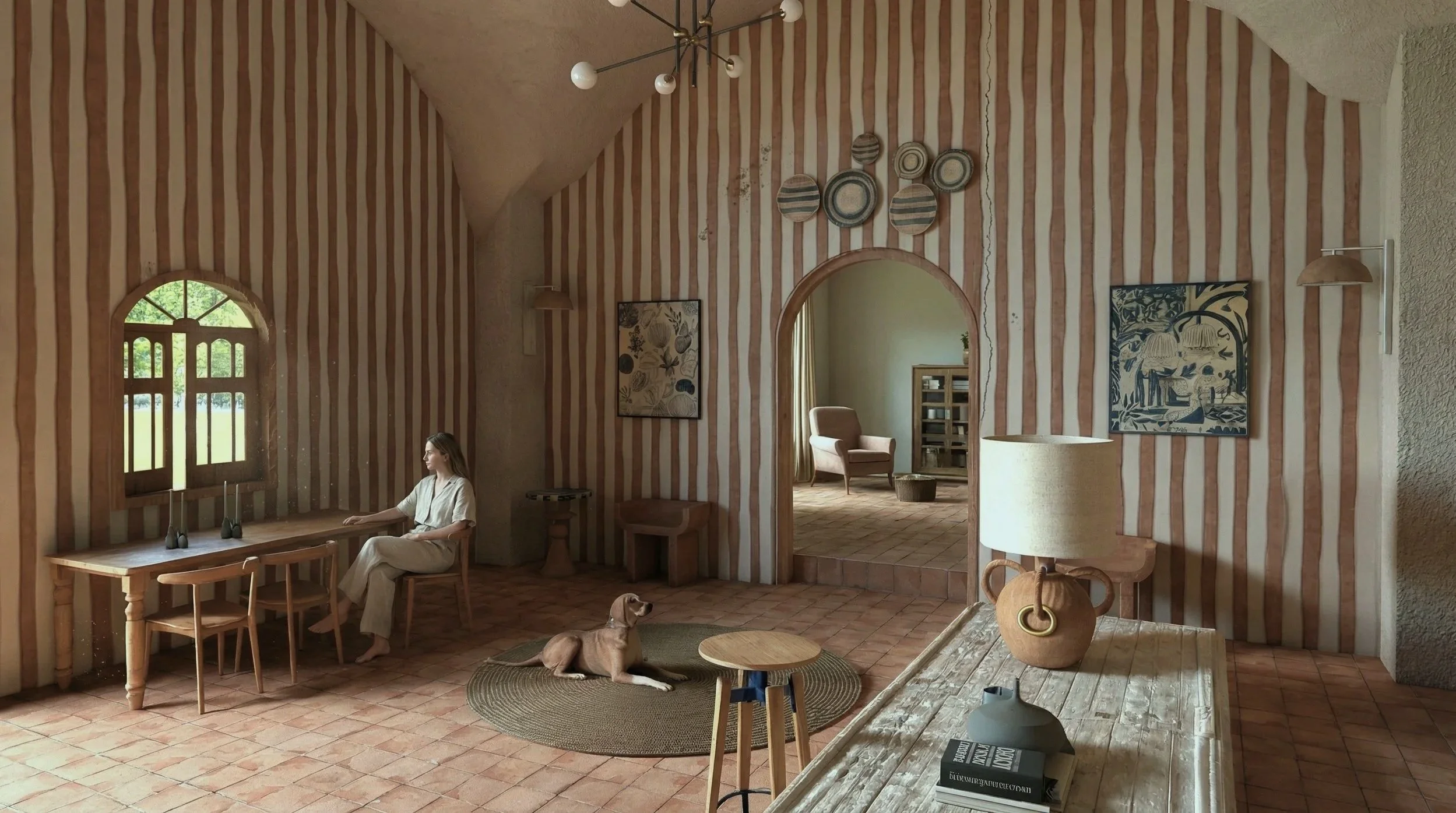 Terracota es una casa que destila una calma que solo los espacios auténticos pueden ofrecer. Sus paredes a rayas de blanco roto y terracota crean un ambiente relajado y acogedor, donde cada rincón refleja el paso del tiempo y la sencillez de lo natural. No es un lugar que busque llamar la atención, pero tiene una presencia tan única que es imposible no notarla.