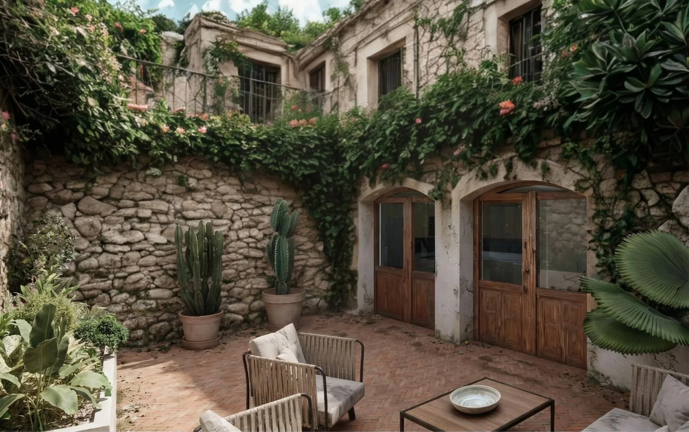 Un patio interior, con sus paredes de piedra desgastada, ofrece un remanso de paz y serenidad. Este espacio al aire libre es un escape tranquilo del bullicio del día a día.
