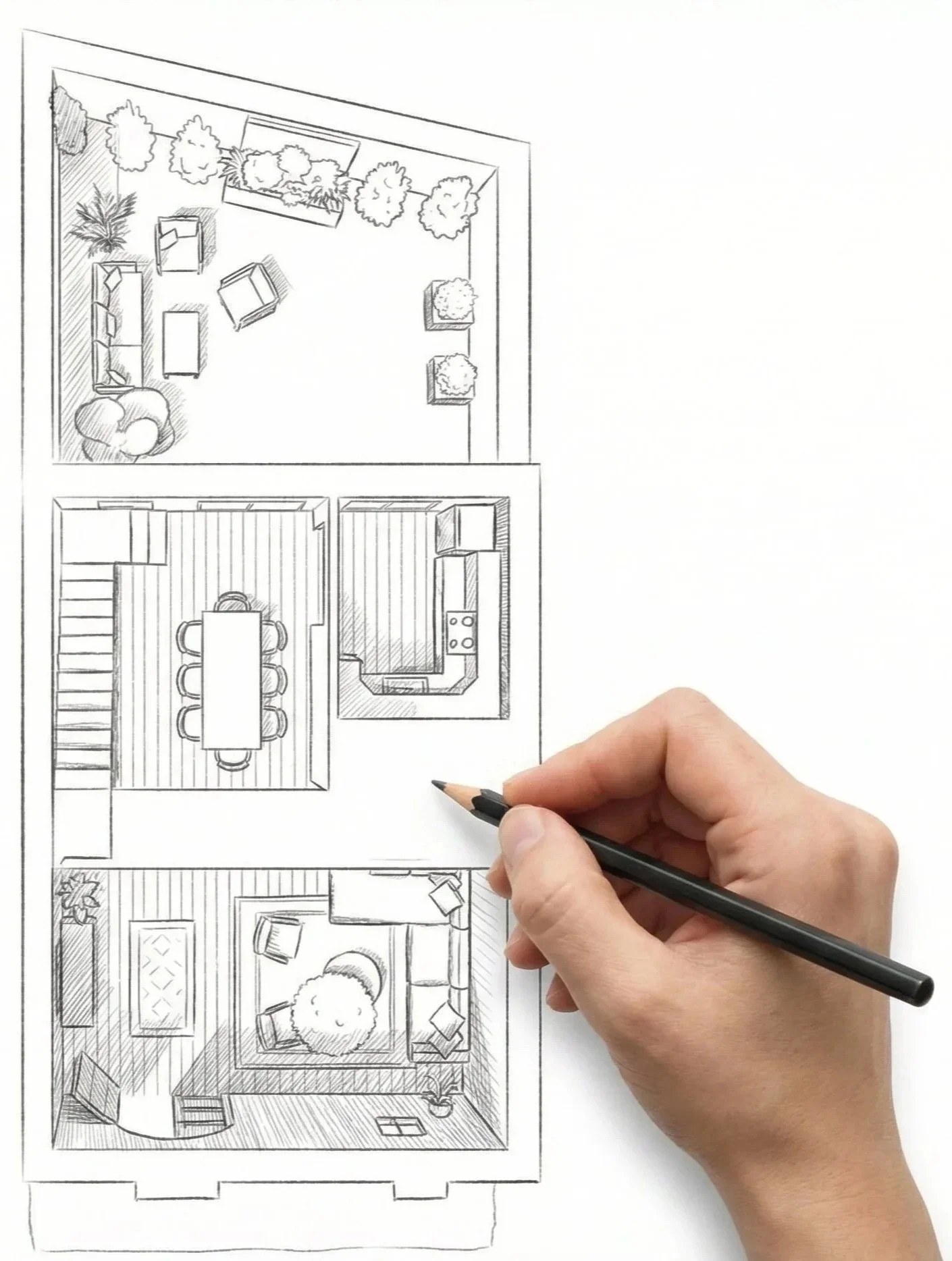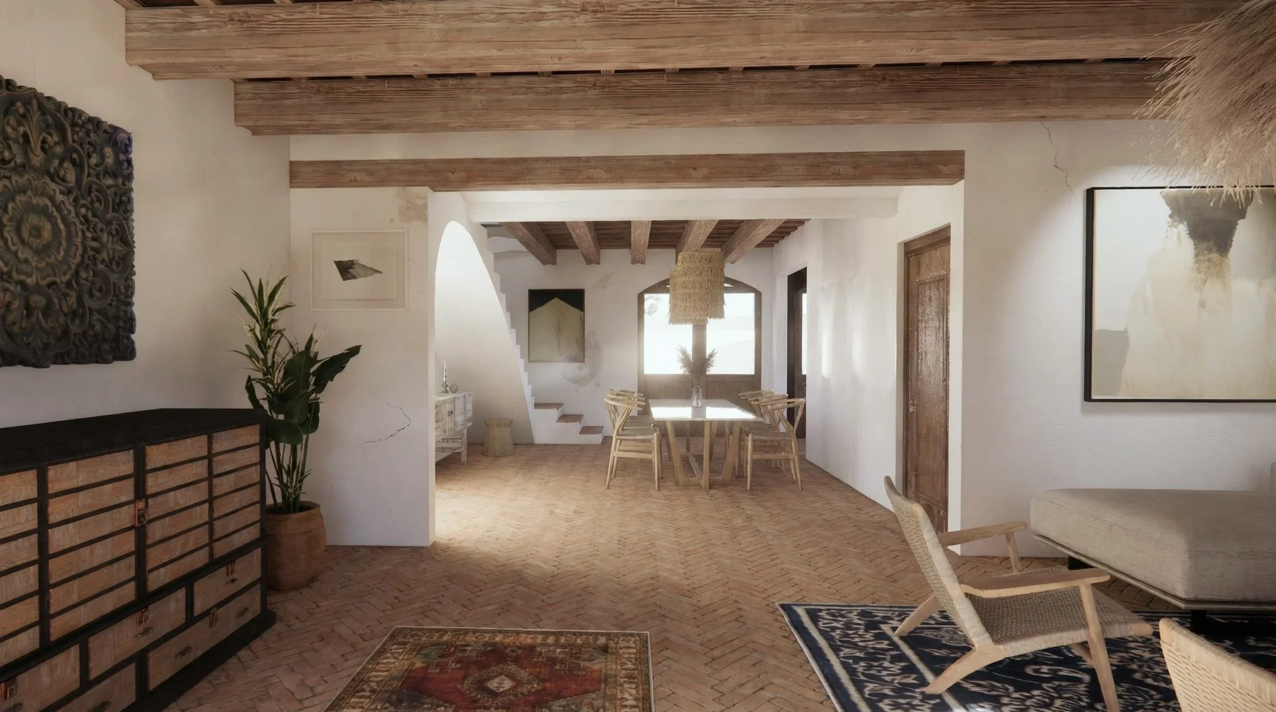 La sala de estar principal es un remanso de calidez y confort. Los techos abovedados de ladrillo expuesto capturan la historia de la casa, mientras que los suelos de piedra natural añaden un toque terroso.