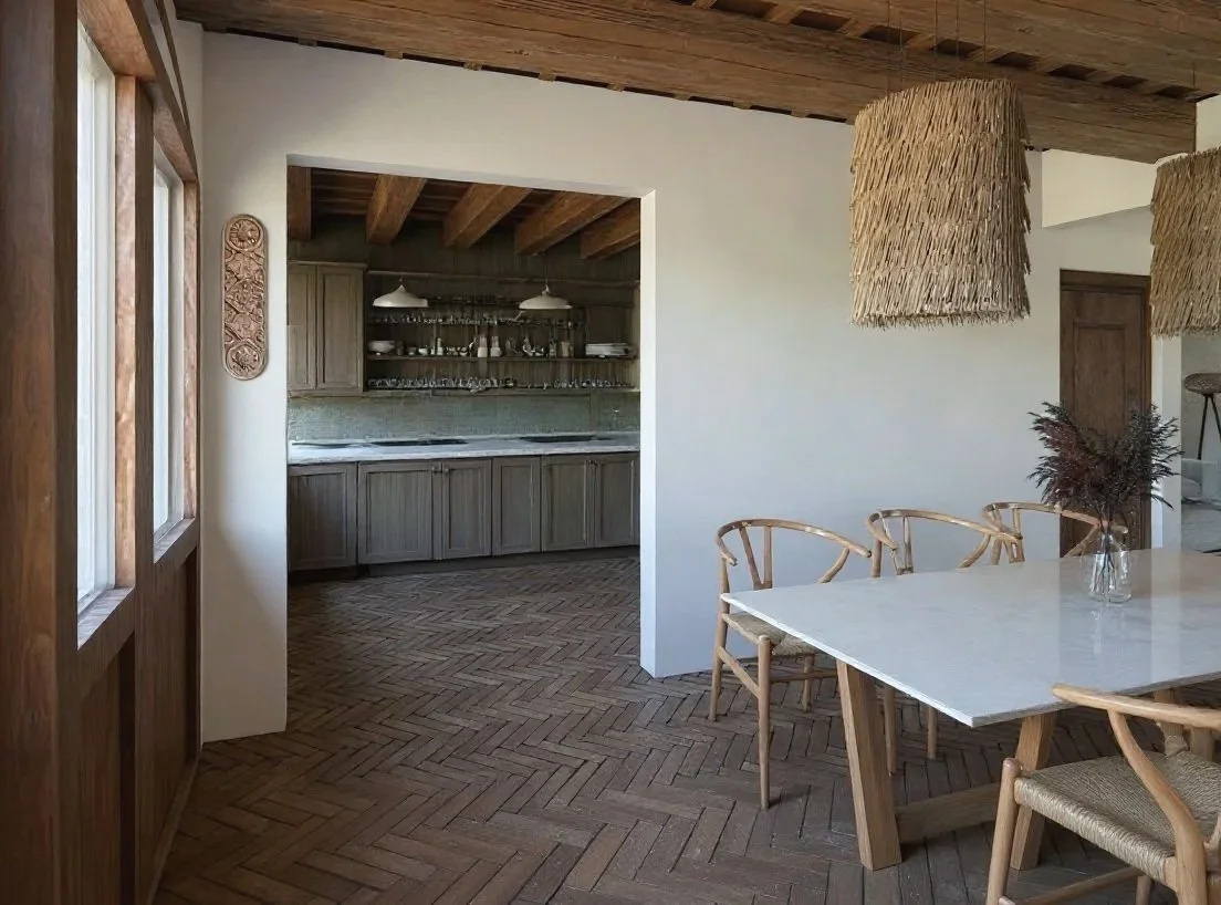 El comedor adyacente es un estudio en elegancia rústica. Una imponente mesa de mármol, se encuentra bajo dos lámparas suspendidas desde el techo abovedado. Las paredes de piedra añaden textura y carácter, mientras que una consola antigua exhibe vajilla de herencia con orgullo.